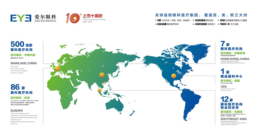 AIER Eye Hospital Group is China’s leading ophthalmology hospital group that covers Asia, Europe, and North America with huge scale and outstanding medical capacity. It has three listed companies in China (stock code: 300015) ,Europe (Spain: CBAV), and Southeast Asia (Singapore: 40T) with a total number of more than 600 specialized eye hospitals and centers and the annual outpatient visits in mainland China exceeded 10 million. Among those eye hospitals and centers, there are more than 500 in Mainland China, 7 in Hong Kong, 1 in the United States, more than 80 in Europe, and 12 in Southeast Asia.